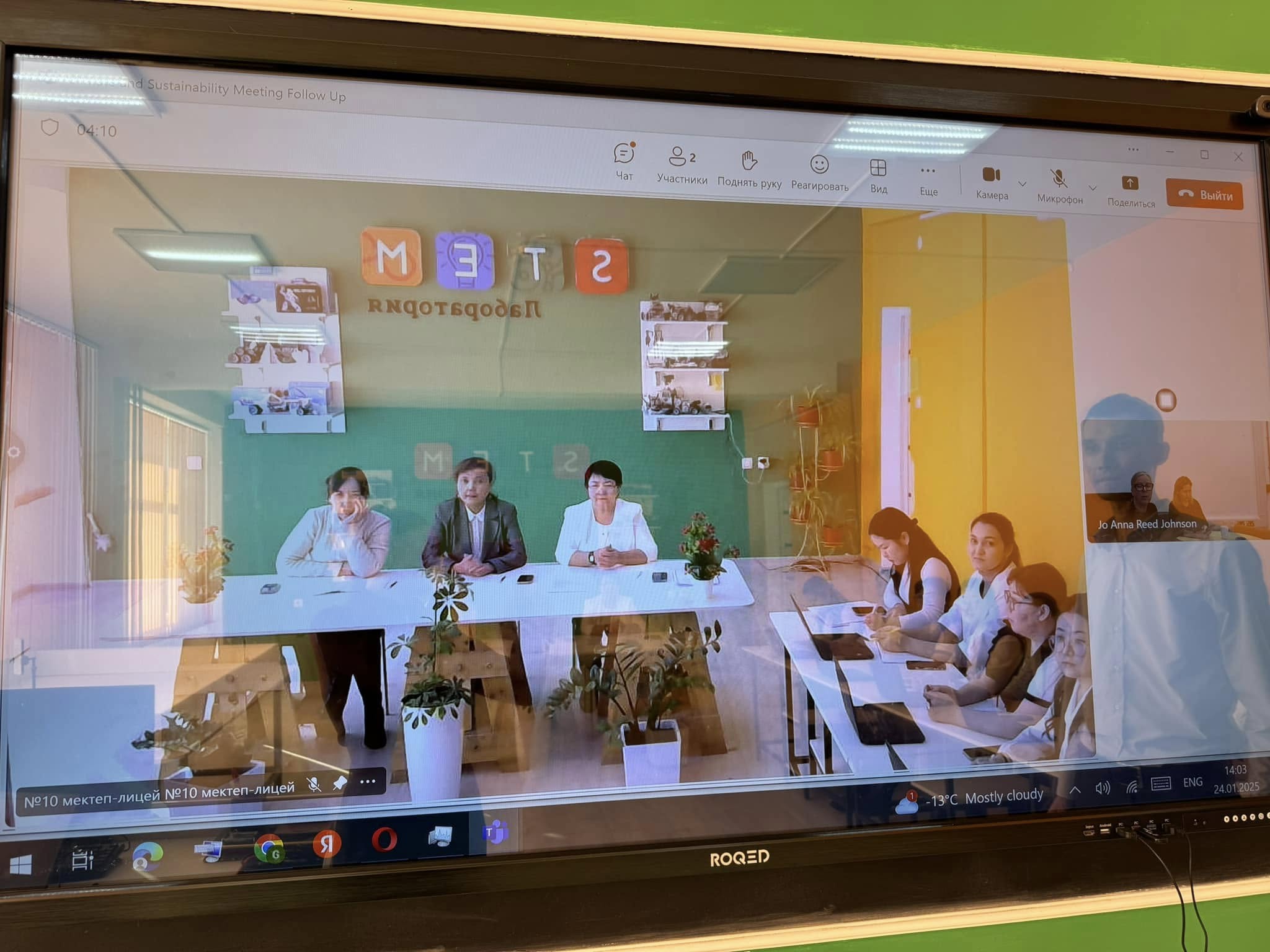 «CLIMATE AMBASSADOR»бағдарламасының жетекшісі Джо Анна Рид Джонсон ханым және мектебіміздің білікті, тәжірибелі ұстазы Абилова Бағила Базарбайқызы өзара тәжірибелерімен бөлісіп, ортақ жұмыс жасауға келісімге келді. Мектеп – лицей директоры Мусабаева Айгүл Нажмадинқызы екі жобаның жаратылыстану бағытындағы пән мұғалімдеріне халықаралық деңгейдегі ғылыми жоба, авторлық бағдарламалар, оқу-әдістемелік нұсқаулық көмек құралдарын шығаруға көптеген мүмкіншіліктер туғызатындығын атап өтіп, ғылыми-зерттеу тәжірибелік алаңы жұмыстарының жандануы сәттілік тіледі
