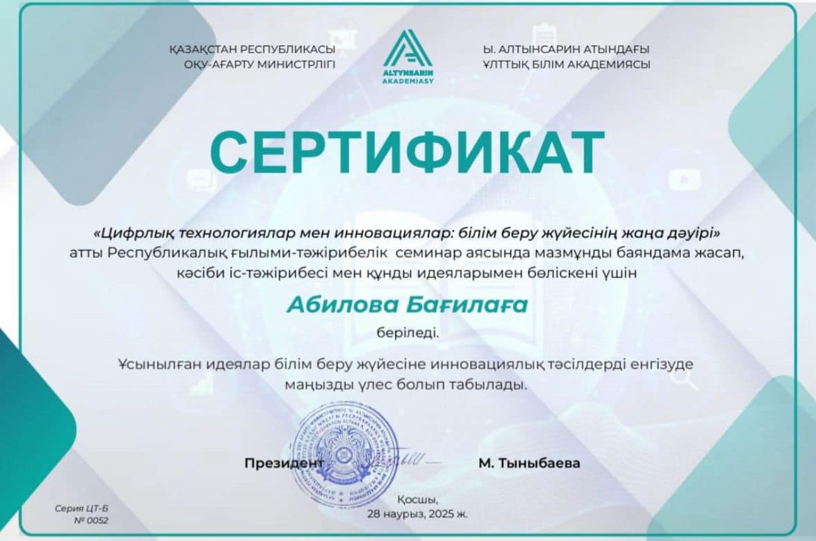 "Педагогикалық идеялар панорамасы- 2024" республикалық байқауында әріптесіміз Абилова Бағила Базарбайқызы үздіктер қатарынан бой көрсетіп жүлделі ІІ орын иеленді.