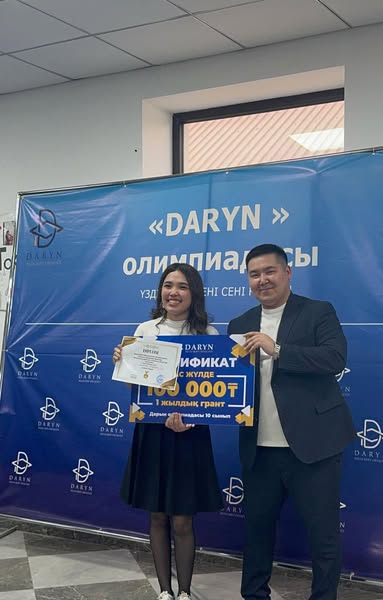 Дарын білім беру орталығының ұйымдастыруымен қала мектептерінің 10 сынып оқушылары арасында ҰБТ форматы бойынша өткізілген “ДАРЫН” олимпиадасында үздік нәтиже көрсетіп 10 “Ә” сынып оқушысы Алмахан Сандуғаш І орын иеленді.