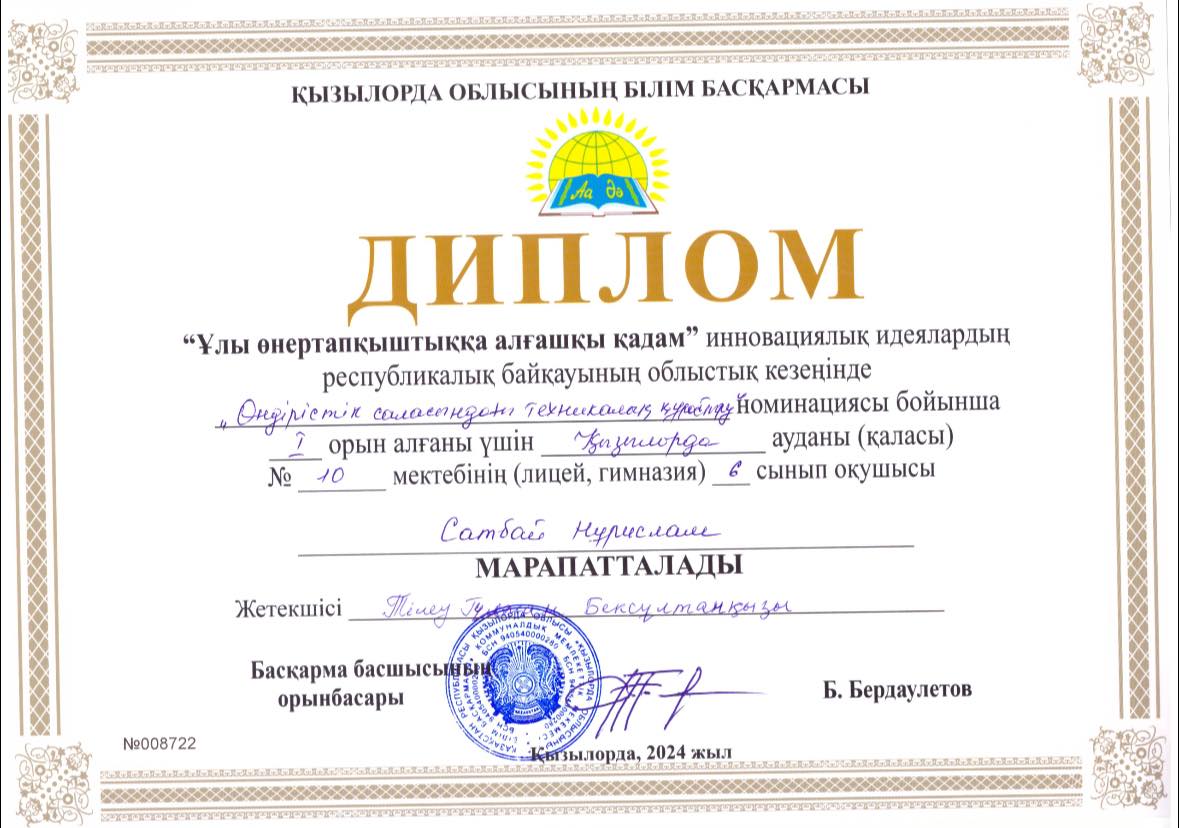 Ы. Алтынсарин атындағы #10 мектеп-лицейдің 6 сынып оқушысы Сатбай Нұрислам “Ұлы өнертапқыштыққа алғашқы қадам” инновациялық идеялардың республикалық байқауының қалалық және облыстық кезеңдерінде “Өндірістік саласындағы техникалық құрастыру” номинациясы бойынша I орын иеленіп республикалық кезеңге жолдама алды.