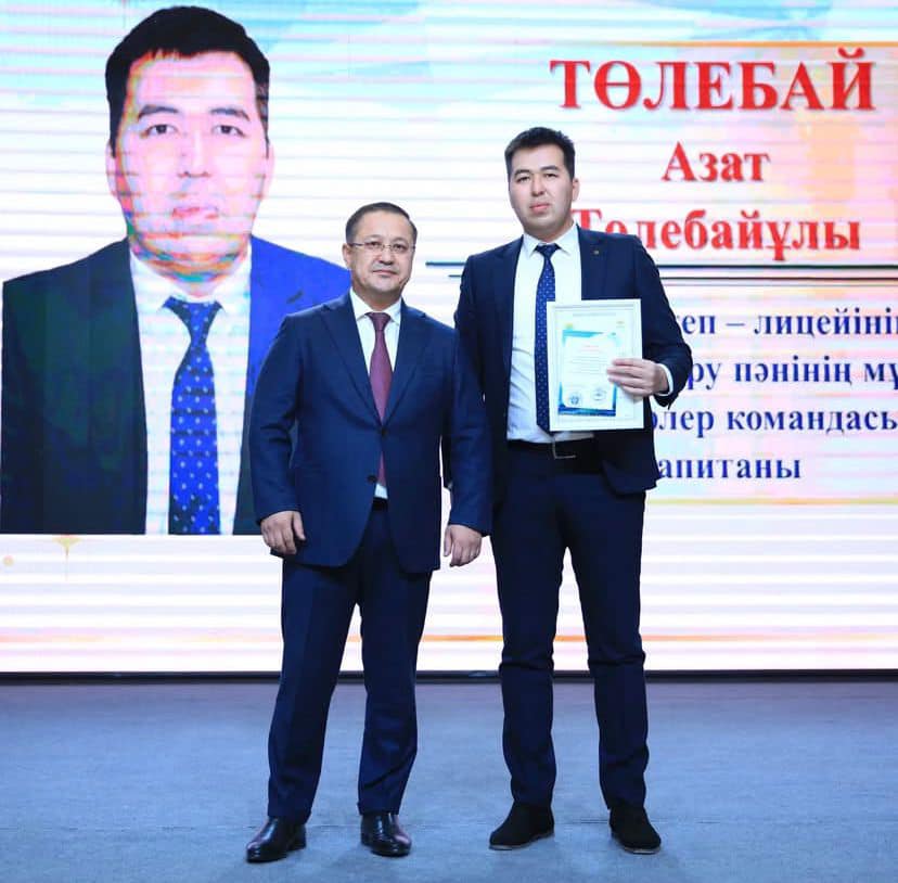 “ЖЫЛ ҮЗДІКТЕРІ” қатарынан көрінген әріптесіміз дене шынықтыру пәнінің мұғалімі Төлебай Азат Төлебайұлын құттықтаймыз. Білім беру саласының дене шынықтыру мен спорт жүйесін дамытуға қосқан үлесі үшін “ҚҰРМЕТ ГРАМОТАСЫ” табысталды. Жыл қорытындысын республикалық спартакиада мұғалімдерінің арасында екі дүркін чемпион нәтижесімен аяқтап,көпке үлгі бола білген әріптесіміздің биік белестері көп болғай