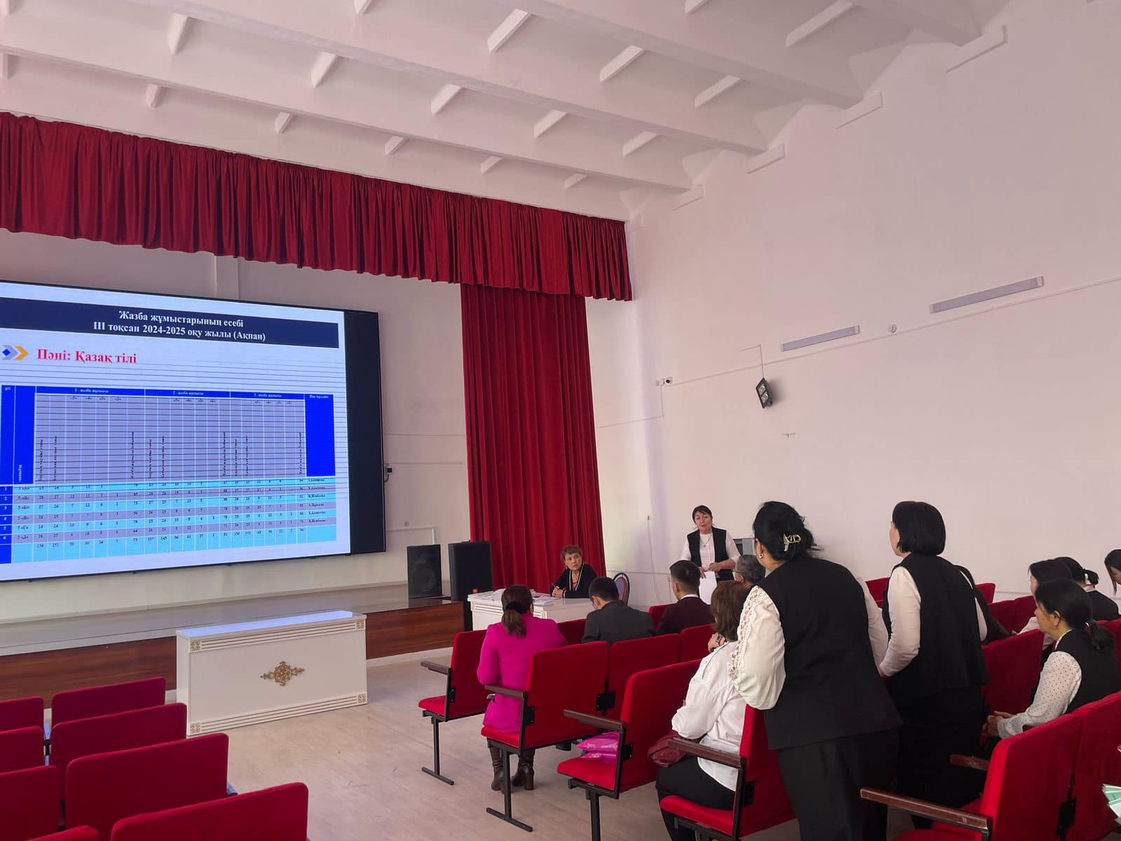 3 - 4 наурыз күндері «Цифрлы ұстаз» кіші мектебінің «Цифрлы ұстаз - цифрлық құзыреттілік» жобасы аясында 2 - 10 сыныптар аралығында негізгі пәндерден алынған мектепішілік бақылау (жазба жұмыстарының қорытындысы) директор жанындағы кеңесте талқыланды.