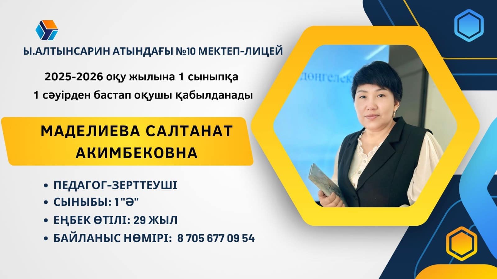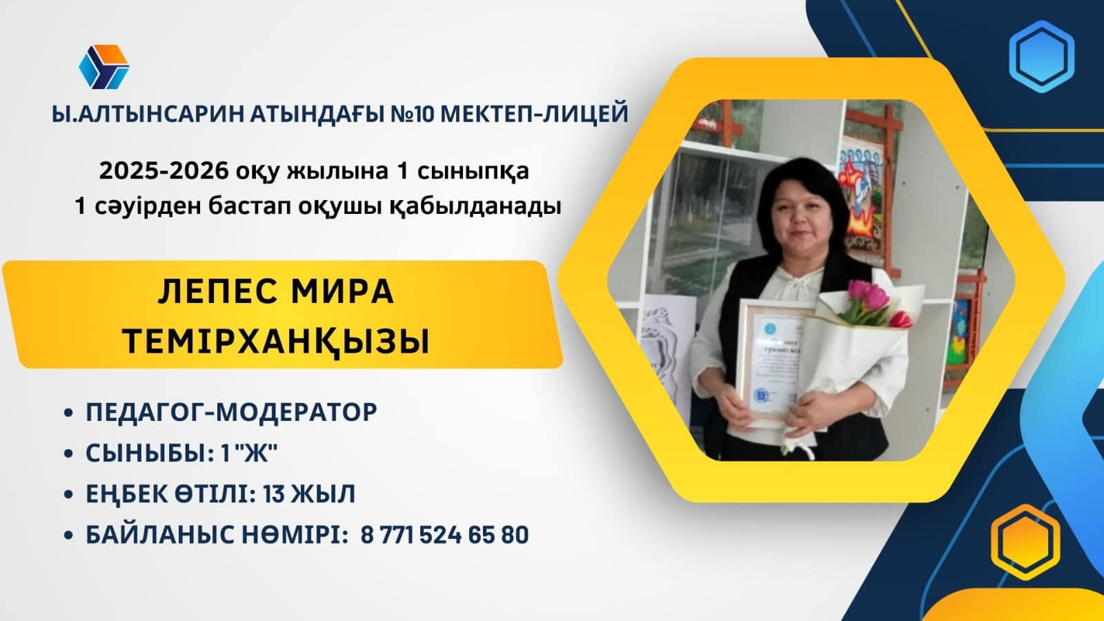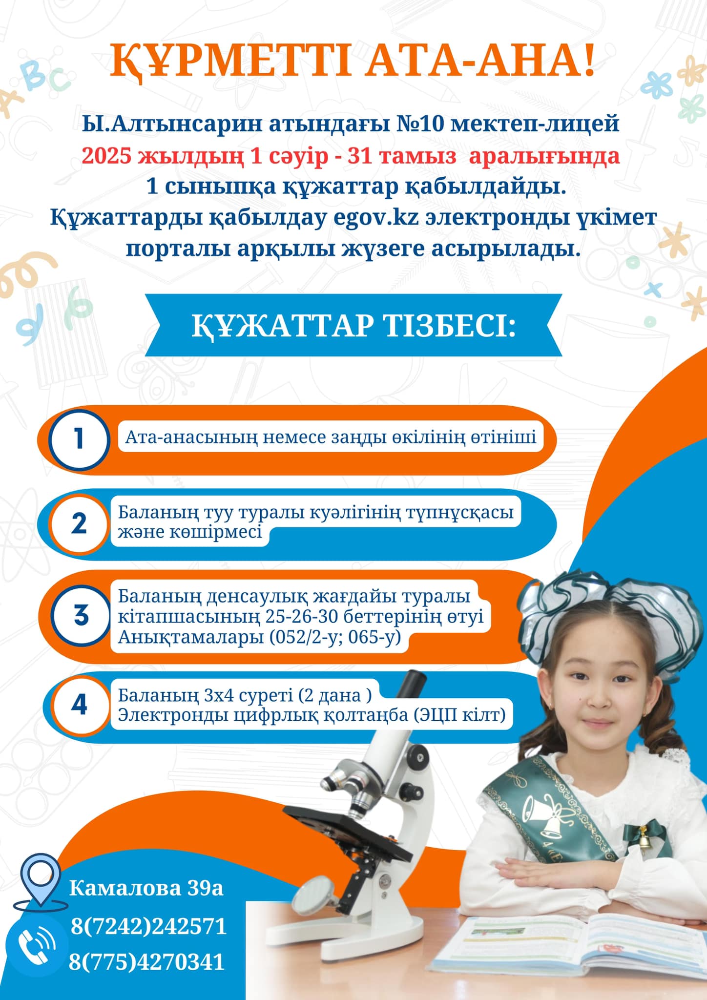 Ы.Алтынсарин атындағы 10 мектеп - лицей 2025 жылдың 1 сәуір - 31 тамыз аралығында 1 сыныпқа құжаттар қабылдайды.