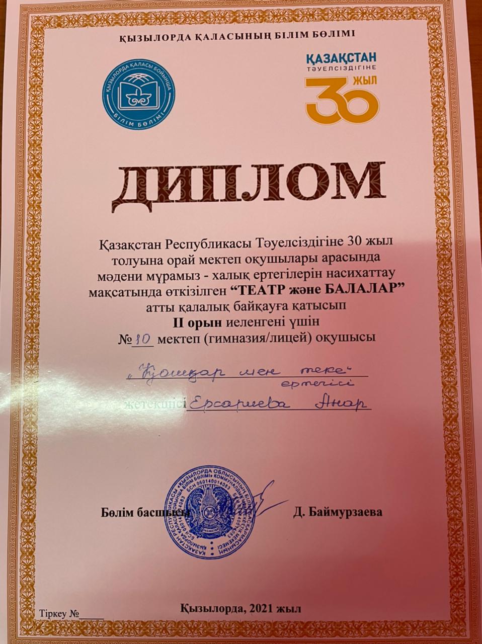 Бүгін Ы.Алтынсарин атындағы №10 мектеп-лицейдің 3 «Ж» сынып оқушылары Қазақстан Республикасының Тәуелсіздігінің 30 жылдығына орай ұйымдастырылған «Театр және балалар» атты бастауыш сынып оқушылары арасында өткен қалалық байқаудан жүлделі ІІ орынды иемденді. Жетекшісі – Ерсариева Анар. Мектебіміздің өнерлі оқушылары «Қошқар мен теке» ертегісін қойып, көрермен қошеметіне бөленді. Өнерлі оқушыларымыздың әлі бағындырар белестері көп екендігіне сеніміміз мол. Талантты оқушыларды дайындаған жетекшісі – Ерсариева Анарға алғысымызды білдіріп, бүгінгі жеңістерімен құттықтаймыз!